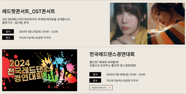 2024년 5월 25일 괴산 유기농엑스포 행사장에서 젊은 에너지가 분출하는 반전의 시골을 만끽할 수 있을거예요.