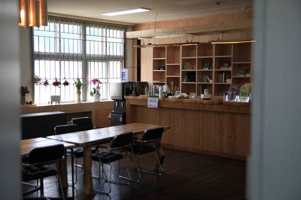 본관 실내의 산촌카페 자동 커피머신을 셀프로 이용할 수 있어요. 카페에는 직원이 상주하지 않고 회의실로도 사용되기 때문에 상시 자유로운 이용은 제한적일 수 있어요.