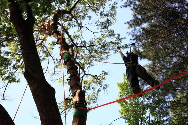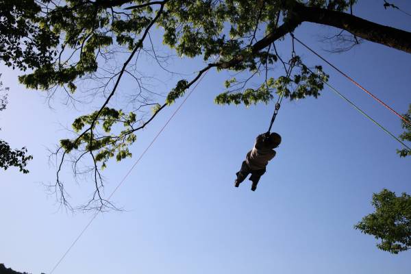 짚라인 출발점에 서는 것부터 여러분의 용맹함을 요구해요. 로프로 이어진 외줄 다리를 건너고 수직 나무줄기를 더 올라야 해요. 처음이 아니어도 후들거리는 다리를 진정시키기 힘들거예요.